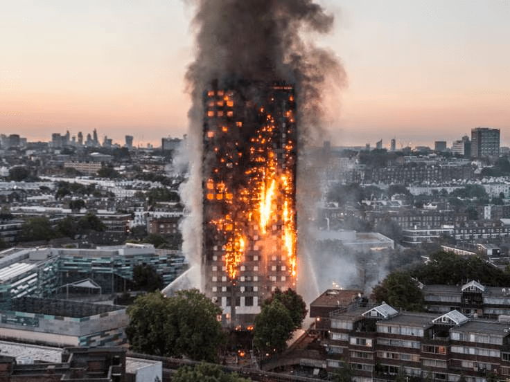 Se inició por un fallo eléctrico en un frigorífico de una vivienda en la cuarta planta, que se propagó rápidamente por el exterior del edificio, llevando las llamas y el humo a todas las plantas residenciales, acelerado por el revestimiento compuesto de aluminio y el aislamiento exterior, peligrosamente combustibles, con un espacio de aire entre ellos que permitía el efecto chimenea. (Wikipedia sobre la Torre Grenfell)