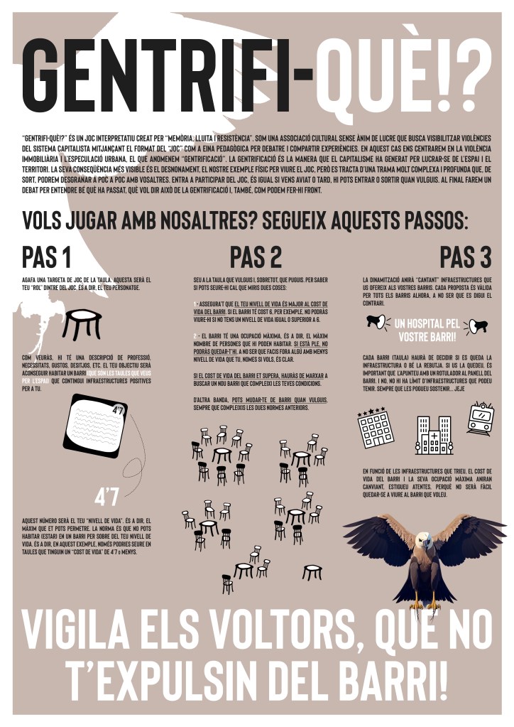 El joc clàssic del col·lectiu Memòria, Lluita i Resistència que aborda la gentrificació desde les seves bases materials. Un joc de creació pròpia que ha anat evolucionant amb l’experiència i és el més «complet» que tenim per explicar la gentrificació, els seus símptomes i les seves conseqüències.