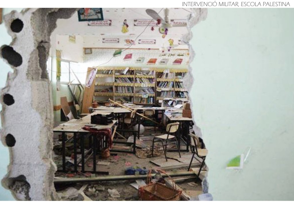 Aquesta és la imatge d’una intervenció militar de les FDI (Forces de Defensa d’Israel) a la Palestina ocupada. És una escola, i l’exercit hi ha perforat els murs en el seu pas cap a una detenció i extermini. No és que l’escola fos objectiu de res, ni que s’hi amagués ningú, «simplement» estava en el camí dels plans de l’exercit isralià.