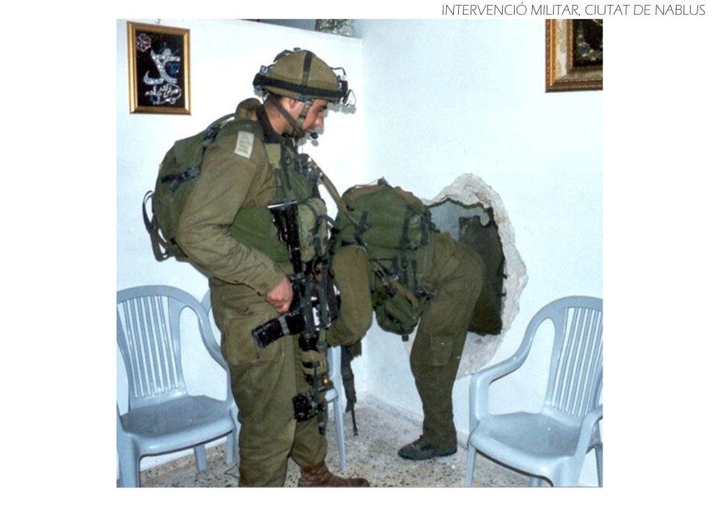 I no, no és un dany col·lateral, no és un explosiu mal llançat ni un error de càlculs en el seu pas. Aquesta imatge és exactament la demostració del seu èxit en la submissió d’una població sencera en el terror permanent i el control absolut. És la possibilitat constant que els murs de l’escola, l’hospital o casa teva, explotin per deixar pas a l’extermini. Aquesta estratègia s’anomena «A Través de los Muros» i és literal: perforar els murs de la ciutat per a crear un laberint interior per on circular com a exèrcit i atacar el poble palestí. És la tècnica militar més demencial que podem trobar avui en dia en la guerra urbana.