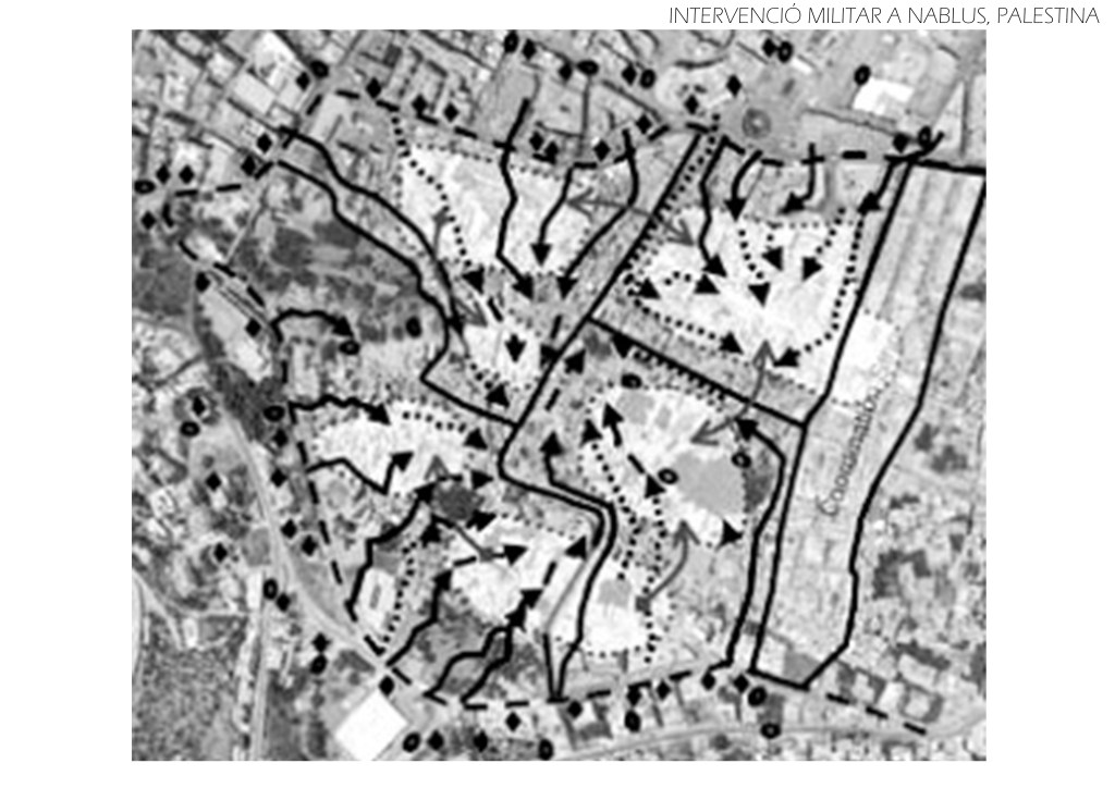* Durant la seva investigació, Nurhan Abujidi va advertir que el 19,6% dels edificis afectats per les rutes forçades tenien una sola entrada-sortida, el 16,5% en tenien dues, el 10% tres, el 4,1% quatre, el 2,1% en tenien cinc i el 10% vuit perforacions. Veure Nurham Abujidi, “Forced To Forget: Cultural Identity & Collective Memory/Urbicide. The Case of the Palestinian Territories during Israeli Invasions to Nablus Historic Center 2002-2005”, presentat en el congrés: Urbicide: The Killing of Cities?, Universitat de Durham, Novembre de 2005.