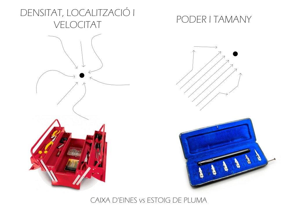 Per expressar-ho en termes més «comuns» podem comparar la «Caixa d’Eines» (proposta de Naveh i Kokhavi) amb un «Estoig de Ploma Estilogràfica» (bloc linial clàssic). L’estoig de la ploma té una forma rígida i només és apta per guardar-hi un objecte concret: l’estilogràfica. Gasta tota la seva energia en resoldre una necessitat inamobible, dóna per fet que les coses seguiran succeïnt així, sense canvis, sense contingències. Sempre guardarà la mateixa ploma, i si algun dia les condicions canviessin: la ploma esgotés la tinta, canvies de forma o necessitéssim guardar un llapis o unes estisores, no podríem. Aquest estoig no està preparat pels canvis ni les improvitzacions. I precisament, del que s’adonen Naveh i Kokhavi és que la «guerra» exigia un canvi de mètode, sobretot quan parlem de «guerra urbana». L’estoig, inmòbil, eficient per una tasca concreta, resolutiu, en la nostra metàfora és el «Bloc Militar», es basa en la força, el poder i el tamany. Ataca de front, supera en número i potència de foc. Arrassa el camp de batalla, com un llampeg, és ràpid, eficaç i devastador. I això en camp obert era el que es portava practicant segles i segles de món bèlic absurd. Ara bé, les FDI s’adonen que la «guerra» urbana és totalment diferent…