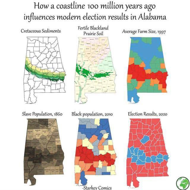 La composició del sòl i la seva fertilitat van dur a situar les colònies d’esclaves a la zona, propiciant un % de població negra molt alt en certes zones de l’estat d’Alabama que es tradueix en el vot demòcrata (marcat en blau) resseguint exactament la forma geogràfica de les terres fèrtils del primer mapa.