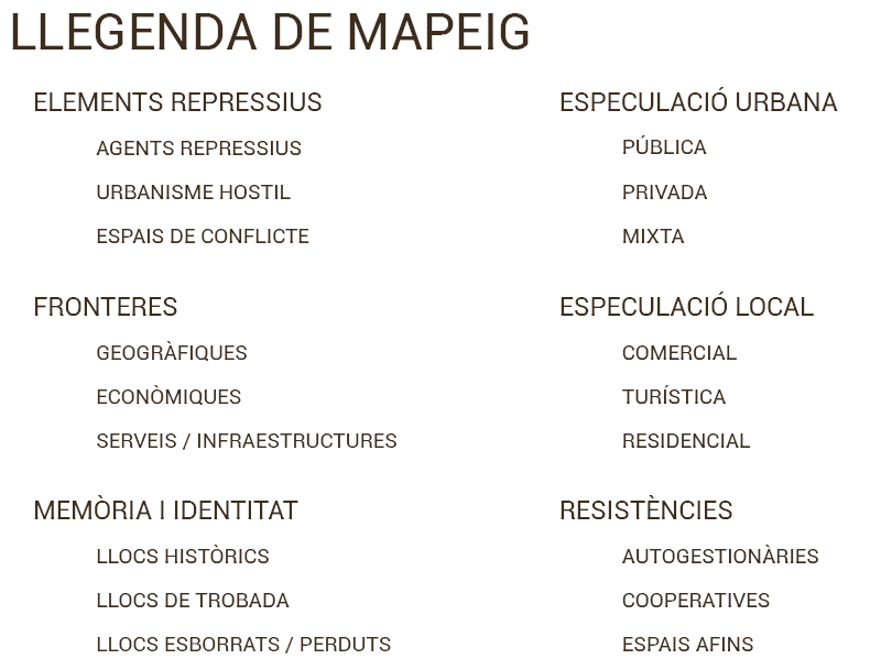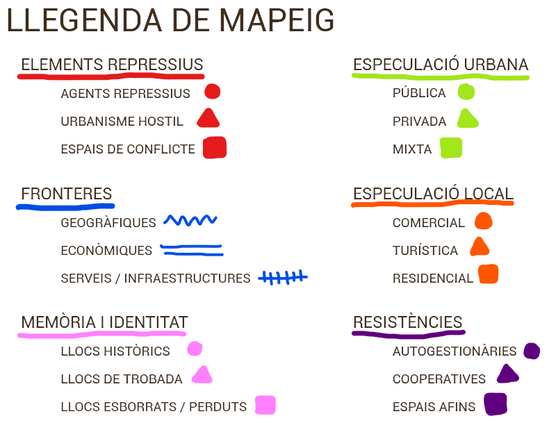 El taller, doncs, es basa en fer aflorar aquestes capes, superposar-les en mapes de la zona a estudiar i poder fer-ne lectures conjuntes per a traçar estratègies tant d’elaboració de discurs i del passat, com de prevenció del futur. La nostra proposta és treballar a partir d’una llegenda bàsica que ens permet unificar mapes de diferents zones i fer un treball comparatiu, però es pot adaptar la llegenda als interessos de cada territori. La nostra base és aquesta: