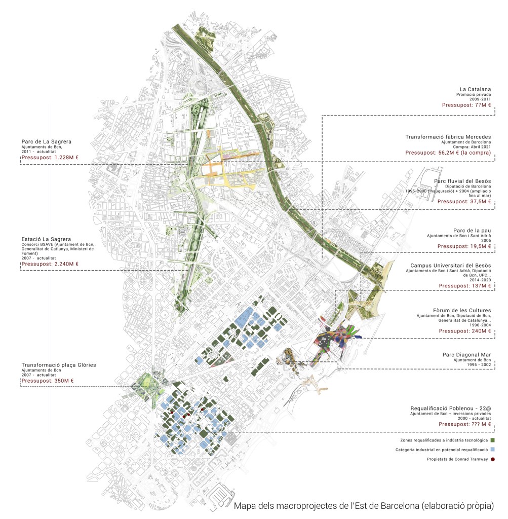 D’altra banda, i més localment, l’any 2016 vam començar a elaborar un mapa del nord-est de la ciutat de Barcelona, de l’entorn del riu Besòs. Tot i les actualitzacions més recents ja ens vam adonar llavors que barris com el Bon Pastor serien espais d’interès especulatiu en els primers mapejos, doncs el barri quedava comprès entre dues grans intervencions (l’estació de la Sagrera i el sanejament del riu Besòs). Aquesta condició geogràfica juntament amb les intervencions del 22@, el Fòrum de les Cultures, el Rec Comptal i la Plaça de les Glòries ens demostrava que la ciutat estava estenent-se cap al nord, pressionant els barris dels districtes de Sant Martí, Sant Andreu i Nou Barris.
