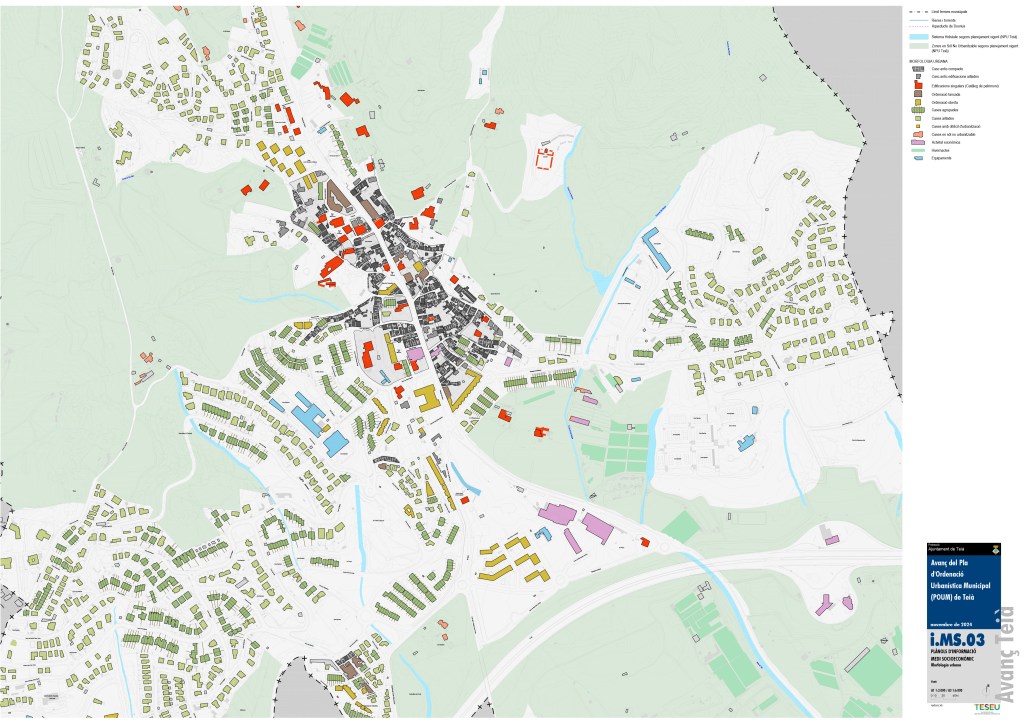 Per exemple als documents previs a l’aprovació del POUM del poble de Teià hi trobem aquest plànol que ens podria ser prou útil per pintar-hi a sobre o fer servir paper de forn (sí, el típic translúcid) per fer-ne capes en diferents plans.