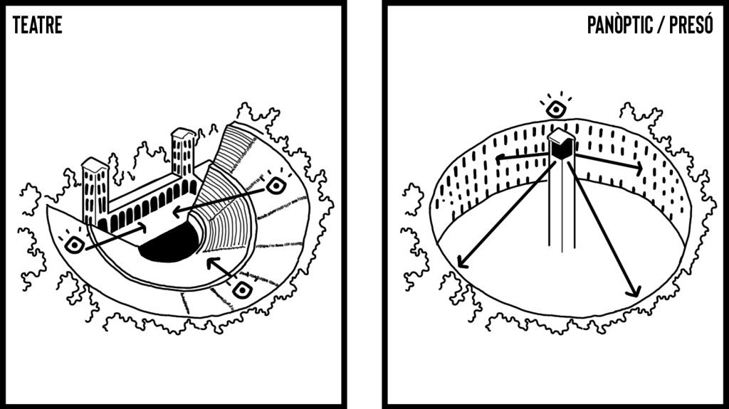 En términos arquitectónicos podemos decir que Foucault identifica un cambio fundamental: del teatro (los suplicios públicos en la plaza) a la prisión (el encierro como economía del cuerpo). Pasamos de los suplicios como castigo de expiación y resonancia colectiva (espectáculo público), hacia los encierros íntimos (vigilancia individualizada y permanente):
